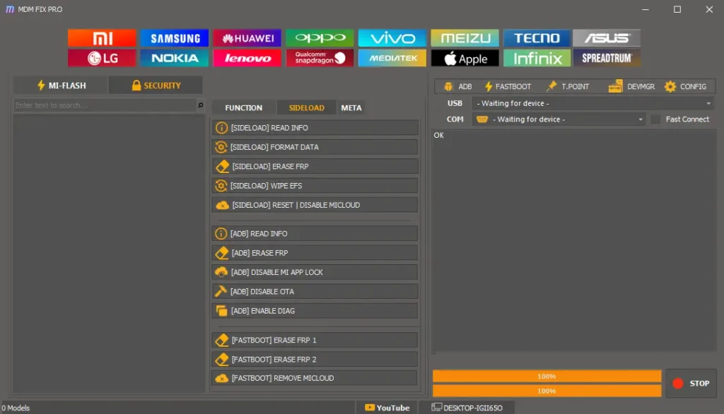 MDM Fix Pro Unlock Tool is an all-in-one repair software made for Qualcomm, MTK, Samsung, Xiaomi, iPhone, and PAC devices. It allows technicians to perform flashing, remove FRP, reset devices, and carry out other service operations from one place. At the moment, the tool cannot fetch model numbers because the developer has restricted the server, so model loading will not work automatically. You can still use the program, but results may vary, and it should be used at your own responsibility since full compatibility cannot be guaranteed.